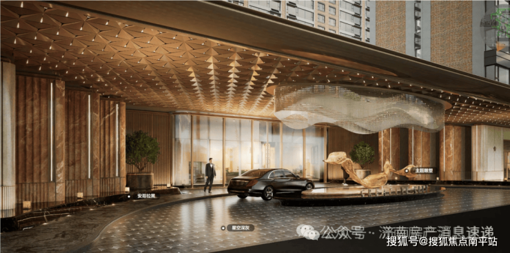 三期汲取国际豪华度假酒店的设计理念,打造奢阔门庭的城市界面,精选奢石与精致金属线条巧妙交织