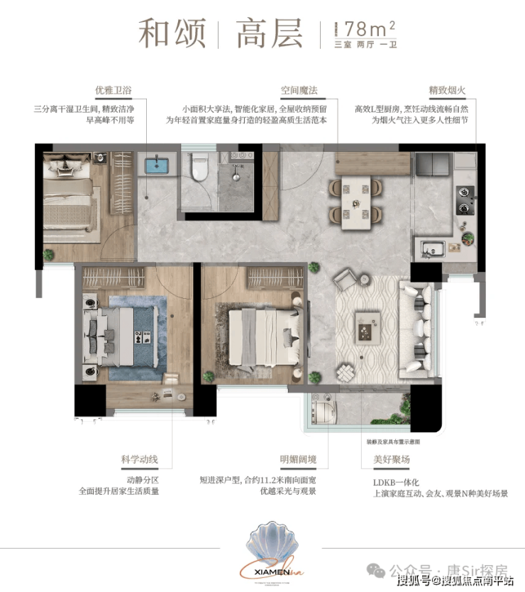 常规的小三房户型做法,没什么特别。
