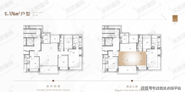 176㎡的4房2厅3卫,设计的是竖厅南北通透格局,双阳台,全赠送独立前室,五开间朝南,双套间设计,主卧270°无柱转角飘窗+2个次卧西南向,1个次卧朝东北,U型厨房,卫生间干湿分离,得房率超100%(包含赠送),阳台西南朝向。也可以做高定式3房户型,有近境典雅风格,召禾隐奢风格。