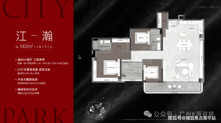 该栋为25层高,两梯三户设计,只有两个面积段,120㎡和140㎡,户型做得不错,在景观展现上用了功,极大程度去放大观江面,比方说超宽阳台、L型主卧转角飘窗、客厅预留观景飘窗等等,主打改善户型,2025年9月整体交房。