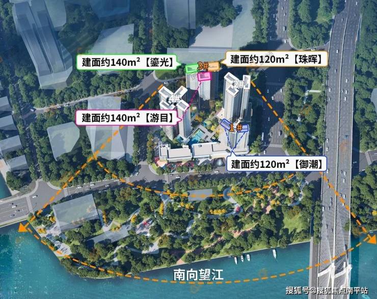 西派粤府采用围合式布局,前后有高度错位,能保障大部分户型能够看到旁边的江景。