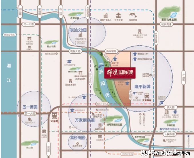 辉煌国际城,位于芙蓉城央、浏阳河与远大路交汇处,地处浏河板块核心;西通长沙中心主城区,东连空港新城板块,北连马栏山视频文创产业园和星沙经开板块,南达武广高铁板块,扼守四大板块黄金C位。