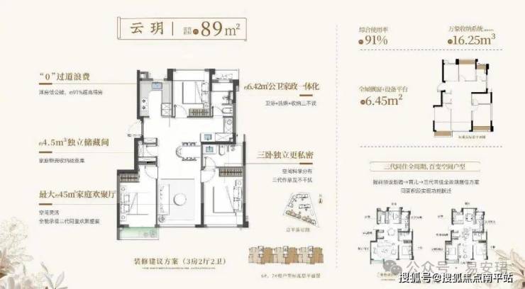 比如89㎡3房活生生比常规户型多抠出13㎡使用面积。