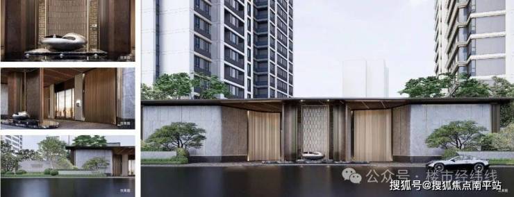 • 约40米恢弘城市界面 ,约7米高的朗阔大门尊崇归家,酒店式奢雅礼序入口,是东方奢华礼制的极致体现。高品质奢雅保加利亚灰柔光面和芝麻黑流水面石材,搭配规整利落有层次的绿篱,整体上营造自然礼序的昭示性城市街角。
