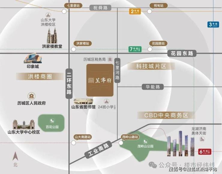 • “三大地铁线环伺”2号线、6号线(在建中) 、7号线(在建中), 其中6号线,北侧洪家楼站距离约0.85公里,花园路站距离约0.8公里,南侧茂岭山路站(工业南路和七里河路交叉口)距离项目约 1.3 公里。