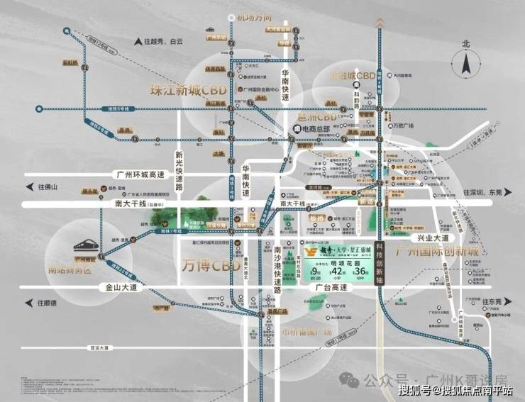 自驾出行:兴业大道/南大干线,番禺东西向发展大动脉,串联万博CBD/广州南站等板块;南沙港快速、新化快速、番禺大道:无缝衔金珠琶,另经金光东隧道,可速达大学城一期。