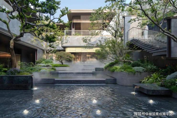 环形港湾之上,孤植一株造型独特的名贵罗汉松,四季常青,寓意守财、吉祥与长寿,彰显家族身份与尊贵;16口喷泉环绕,池心海棠纹树池巧妙融合古厝纹样与现代设计,一步一景,步步生花,尽显雅致与生机。