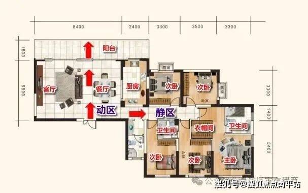 客餐厅一体化设计,南北双阳台,主卧和次卧可打通做成大套间实现主卧小家化;北向卧室带可起到套房效果。