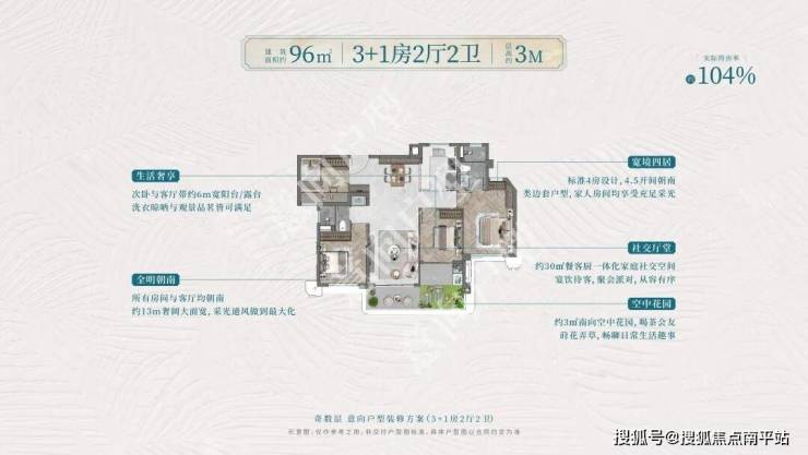 96平做四房客厅面宽约3.2米,做三房客厅约5.9米,层高3米