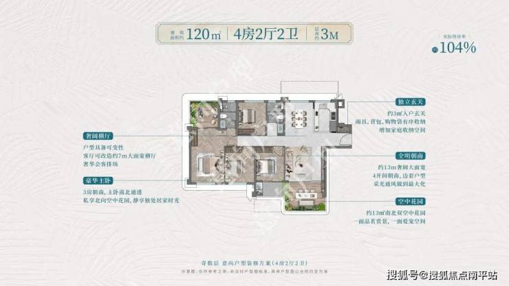 120平做四房客厅面宽约4米,做三房客厅约6.8米,层高3米