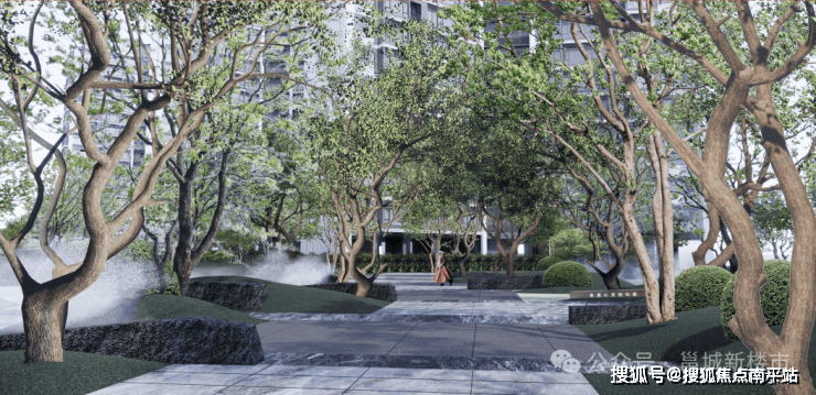 场景空间3(森系多维花园):地块西侧规划森系多维花园,设立乌柏林屿、轻氧健身、阳光草坪、特色景墙、景观汀步、疏影花园、森享吧台、雅致水景、邻里花园、丛林游览等10个景观模块。草木掩映、林木之间,与自然无界共融。