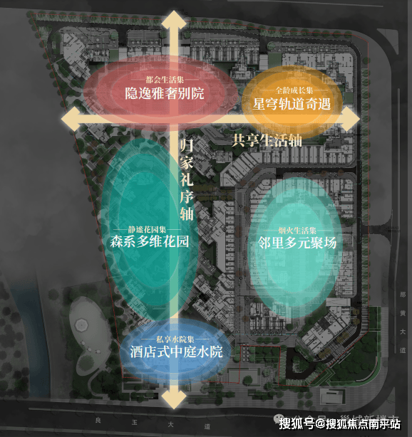 场景空间5(邻里多元聚场):南区东侧匠心规划新烟火主义下的邻里开放式潮玩多元空间,约1.83万方开放式商业街区融合潮流艺术、休憩游览、趣玩舞台、开放商业街区等元素,规划雅奢酒店、多元互动商业街、聚会空间、青年艺术集市、林下健身、潮玩聚场、邻里花园等烟火聚场。
