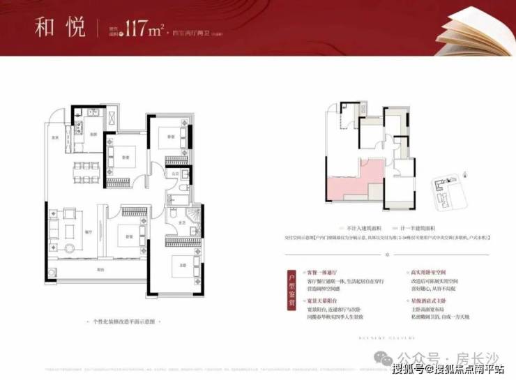 建面约117/118㎡户型 :任意卧室超10㎡,主卧约21㎡,南向阳台约6.8m开间,可改造性强。