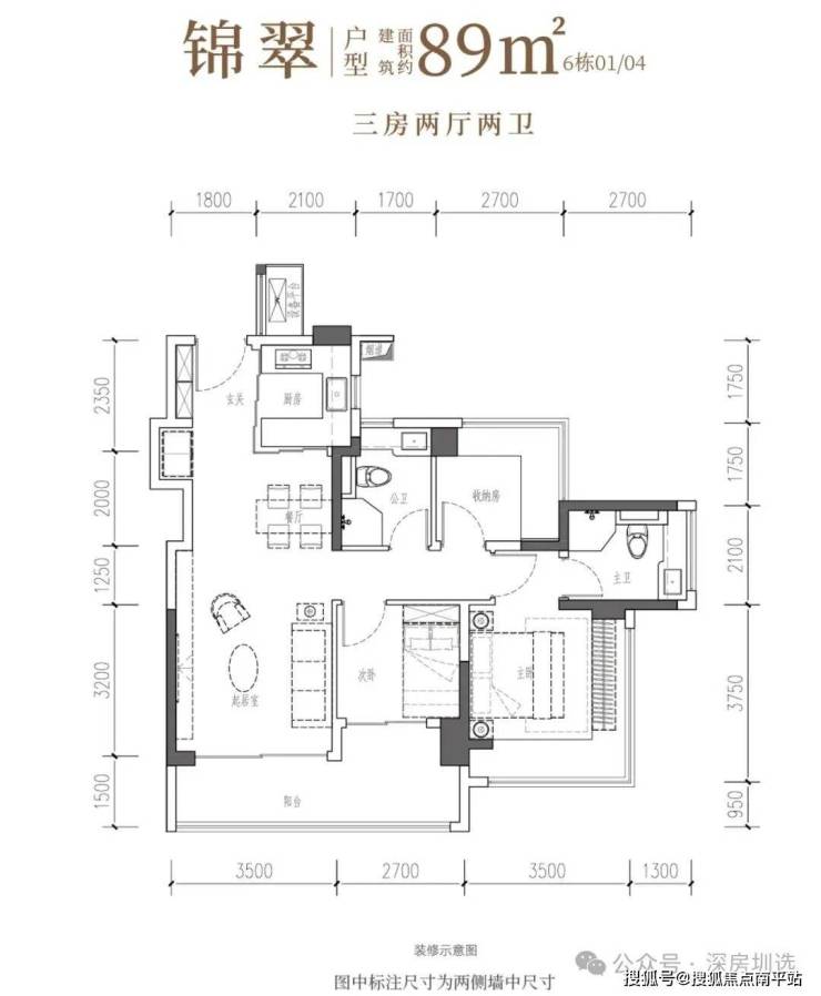 •锦翠·建面约89㎡3房2厅2卫:南向宽厅,阳光满溢,主卧L型采光,空间户户舒适