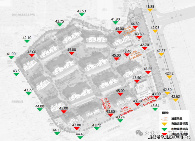 西侧道路标高42-42.6m,小区内部正负零标高45m。