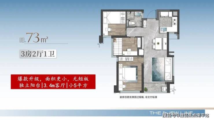 比如73㎡三房,相较同户型减少了5个㎡,但实得面积基本一致,还拥有了独立的外阳台。