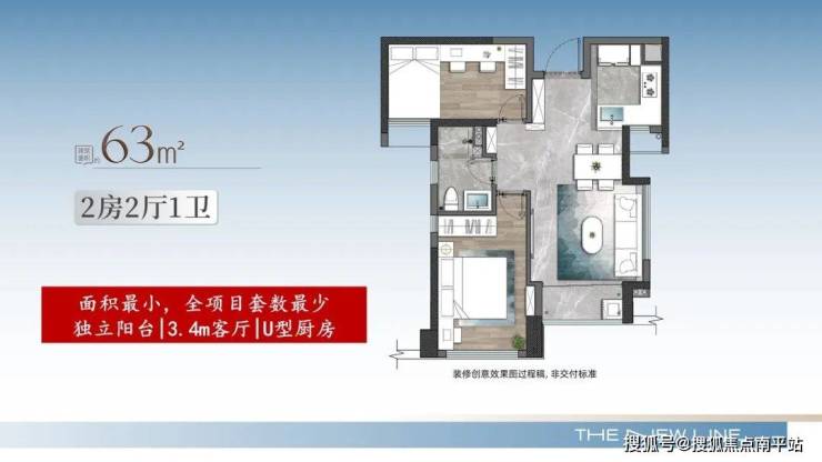 比如63㎡做到标准两房,还拥有3.4米宽的客厅,拥有U型厨房和外阳台,还额外赠送了两个飘窗。这种得房空间放在过去的产品上是不敢想象的。