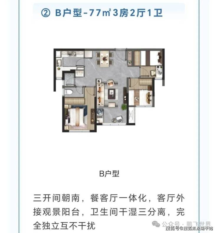 (2)空间革新:77㎡三房采用五开间朝南设计,得房率高达88%,对标岛内100㎡功能;