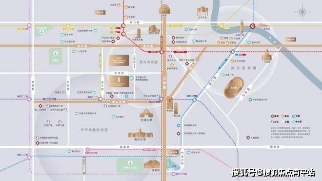 瞩目择址海光寺板块,与卫津路南京路城市双命脉交汇,南开和平双区资源集萃,镜见中轴上的天津未来。