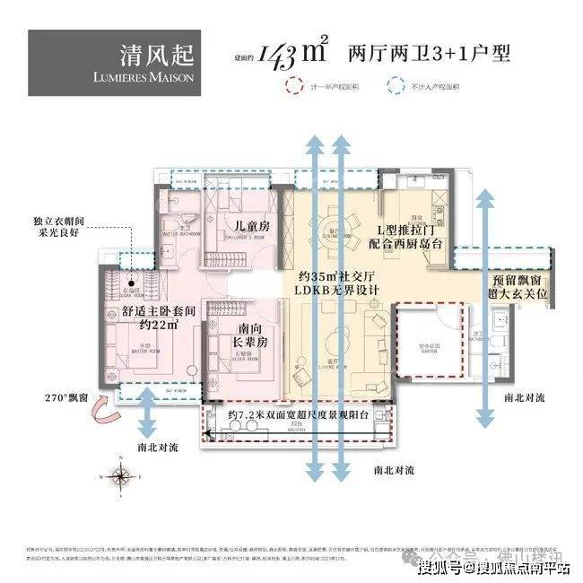 万科世纪灯湖瑧府的户型设计,精准贴合改善型家庭对“空间尺度”与“居住体验”的双重需求:如143㎡3+1房两厅两卫:南北对流格局,南向采光面达15.6米,约7.2米双联阳台可270°环幕观景,主卧套房配备独立衣帽间与270°飘窗,兼具私密性与景观视野;创新类四叶草布局,减少过道空间浪费,家庭成员各有独立空间,多代同堂亦能“亲而不扰”。