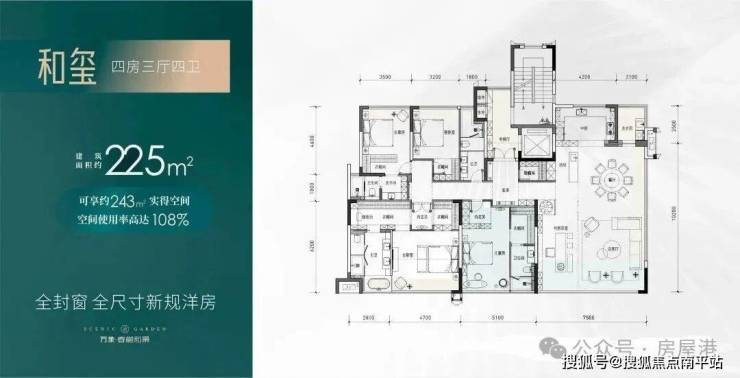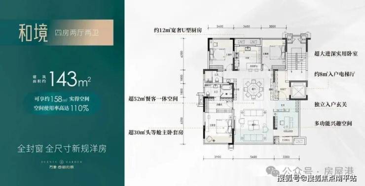 万象春樾和景当前主推建面129-143-168-225㎡全封窗全尺寸新规洋房,整体得房率高达110%-114%,具体户型图如下: