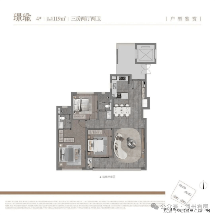 ①119㎡三房两厅两卫(4号楼中间户):刚需上车首选,但私密性有短板。