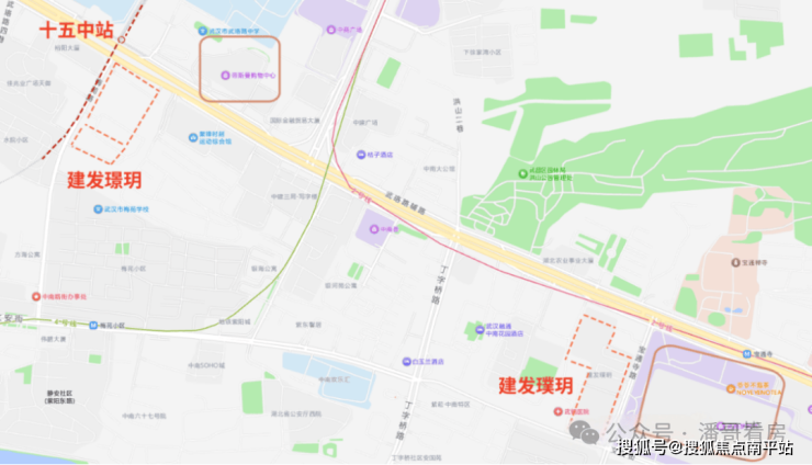 建发璟玥位于武昌区武珞路与梅苑路交汇处,也就是原来的傅家坡客运站B、C地块,属于妥妥的武昌内环边,这个环线位置在武昌核心区里算“第一梯队”。