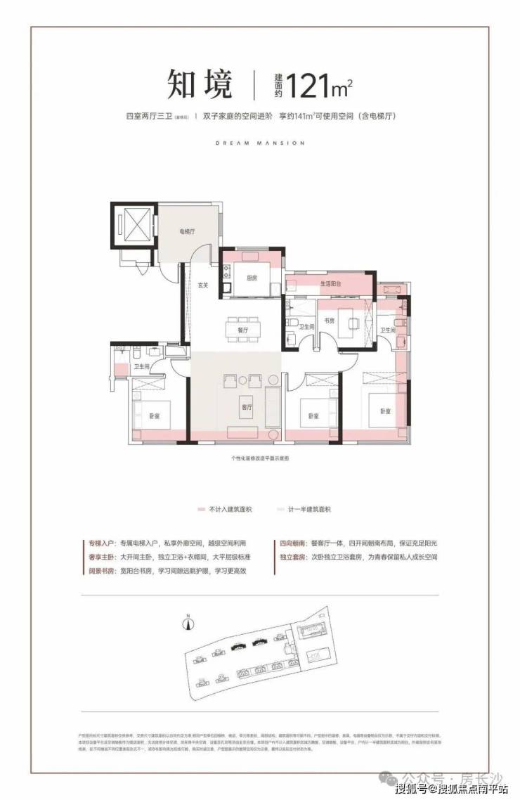 建面约121㎡4房: 约5m客厅开间、满足双孩家庭的大空间, 得房率约116% ,实得面积143㎡(含电梯厅)。