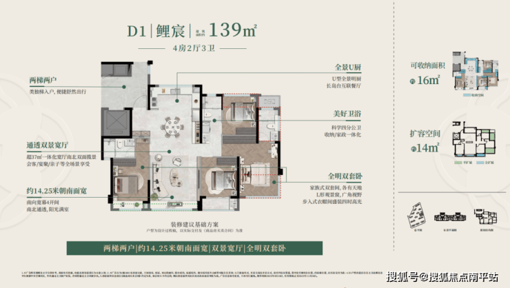 建面约139㎡户型,全屋加码约16㎡收纳空间,两梯两户设计,户户拥有约9㎡独立电梯厅,超14米南向四开间+全明双套卧,主卧带270°转角窗,配置堪比160+㎡的居住享受;