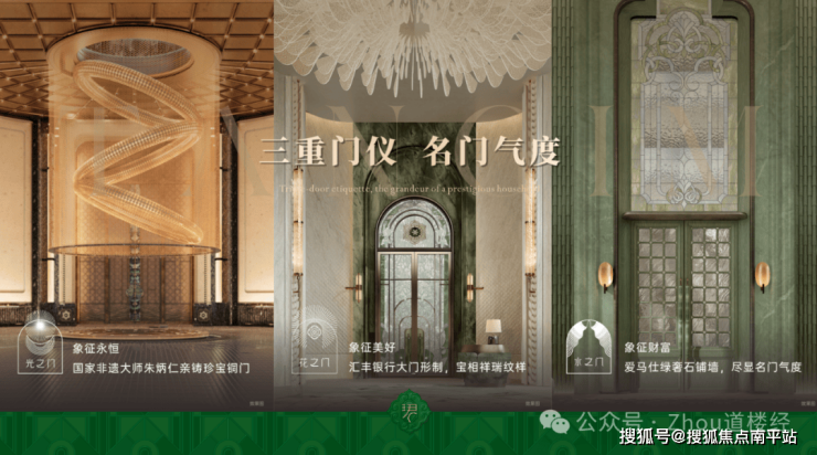 【三重门仪】光之门由国家非遗大师朱炳仁亲铸珍宝铜门象征永恒,花之门以宝相祥瑞纹样寓意美好,水之门以爱马仕绿彰显财富气度,复刻名门归家仪制。
