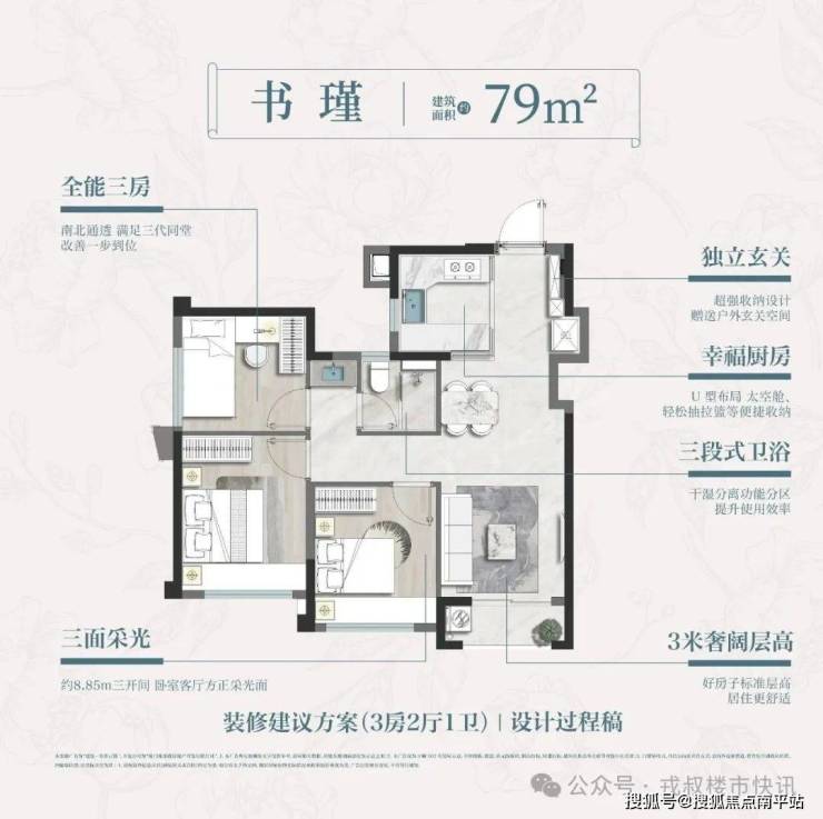 79㎡做全能类边户三房:虽是中间户,但做出了边套居住感,超大采光面与观景面,直接把改善需求塞进了刚需面积! 乐活岛79㎡做三房的仅此这块新地块。