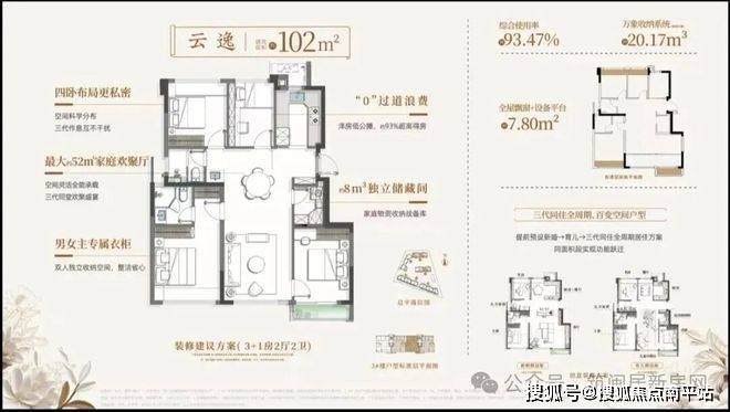超高得房率是其最大亮点:89㎡得约91%,102㎡得约93.5%,112㎡得约92%。