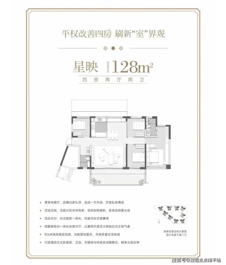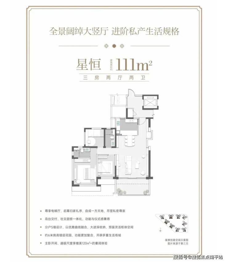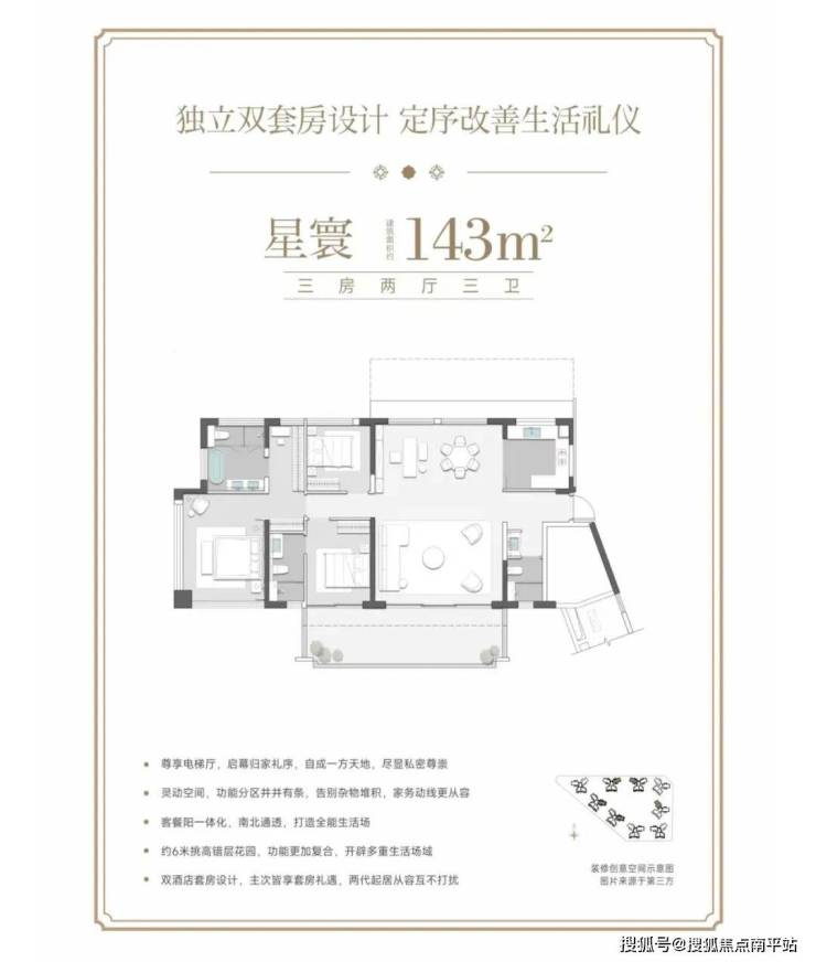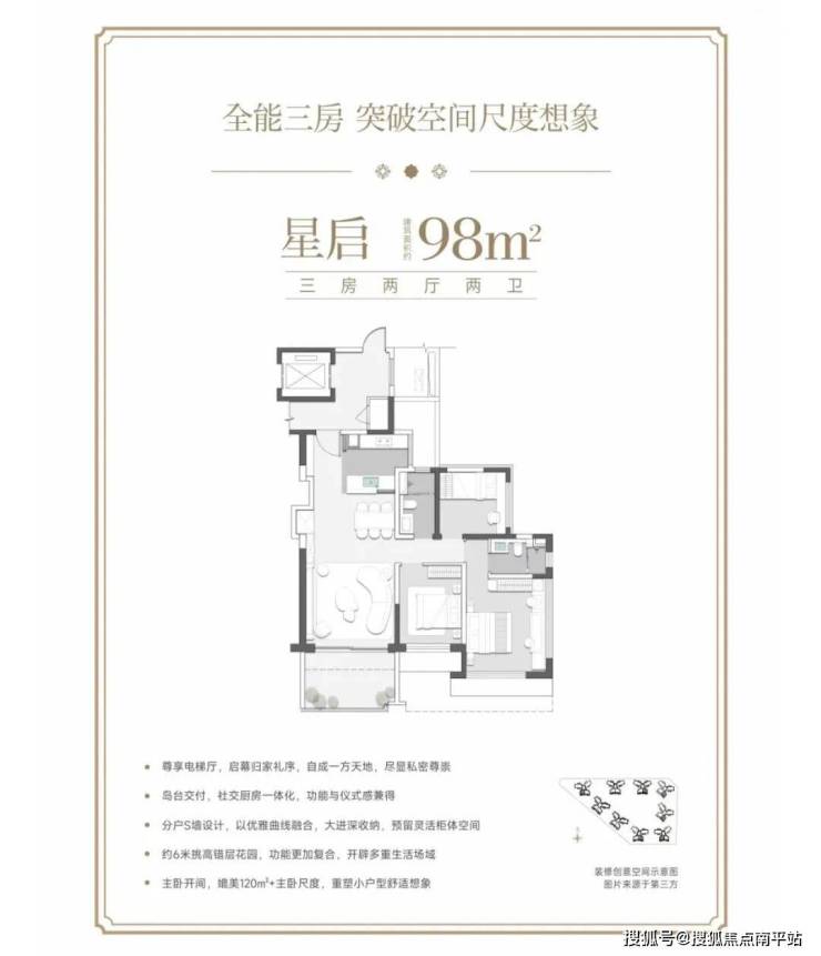 主推98-143㎡三至四房,得房率普遍120%-130%。全系私梯入户、6米挑高空中院子、LDKB一体化横厅,改善感拉满。