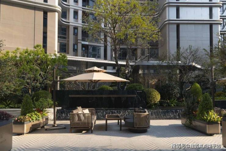 登高面一侧,水幕与石材肌理相融的水景景墙成为视觉核心。错落的植物组团与精致户外家具相得益彰,这里可以是星空下的会客厅、晨曦中的瑜伽台,也能是独自凝望城市天际线的思考角落。