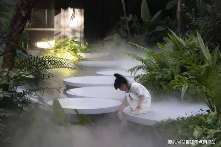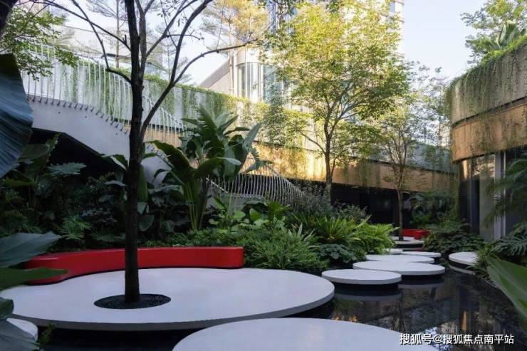 雨林花园以光影为笔,水系与植物空间相互渗透,让空间充满呼吸感与生机。洁白水磨石汀步搭配热烈红色坐凳,为整体增添浪漫气息。