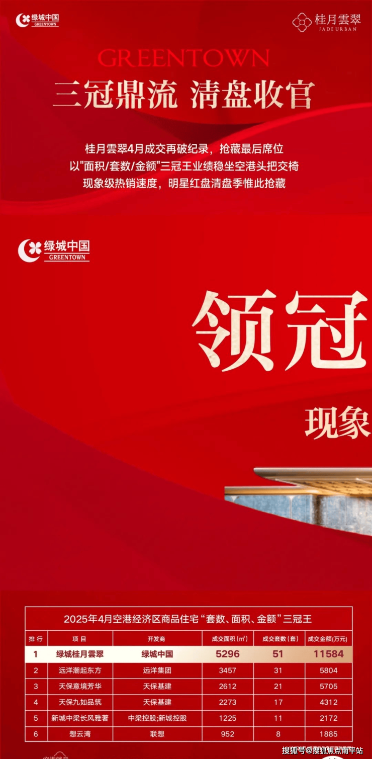 绿城·桂月雲翠以“现象级红盘”之姿,在2024年楼市中首开就书写下销冠传奇。作为绿城华北首个践行“好房子”六维标准的标杆项目,雲翠凭借顶流产品力与绿城品牌势能,截止2025年4月累计成交面积64123㎡、累计成交套数604套,累计成交金额135821万元,首开至今连续8个月蝉联区域“面积、套数、金额”三冠王席位,刷新空港高端住宅销售纪录。其热销背后,是绿城对第四代住宅的深度革新——首创全首层架空社区,整体抬高5.6米打造立体城市上层生活;奇偶层错层空中花园、钻石切割立面、超奢窗墙比等设计,重新定义城市封面人居标准。