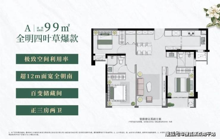 建面约99㎡户型则重新定义了紧凑型住宅的价值标准。 作为泉州市场稀缺的百平以下产品,以约12.2米南向大面宽,远超传统99㎡约10米的标准面宽,实现正三房+客厅全南向布局,配合4面采光设计,使整体采光效率较传统提升一倍以上。