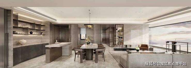 所以项目独创了“ 全景舱”空间,更在室内背景墙、天花等位置,特意选用能与江幕景致内外呼应的奢石、纹样,以此将景引入内,达到拥有的极致。