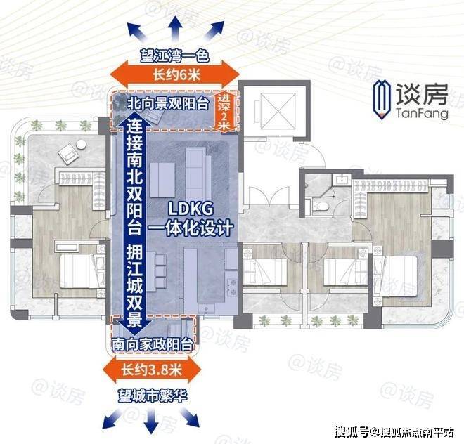 LDKG一体化客厅公区,连接南北双阳台,南向家政阳台望城市繁华,北向景观阳台赏江湾一色。