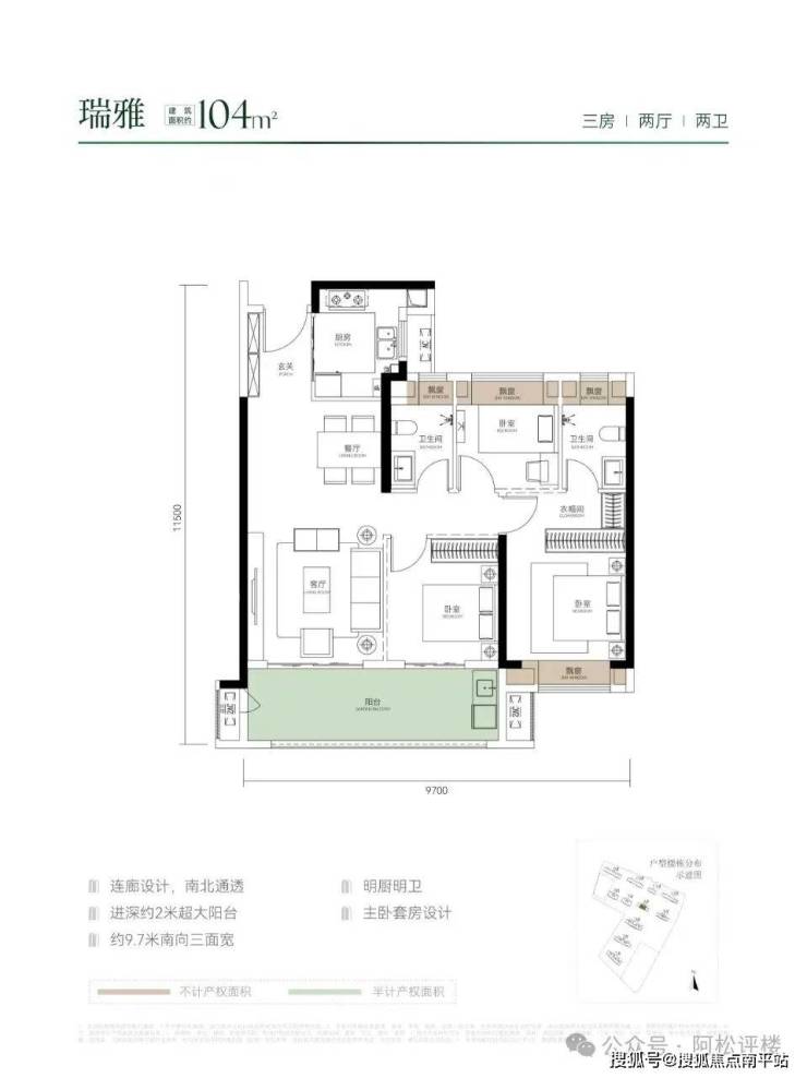 建面约104平 三房两厅两卫:6号楼中间户,北边对连廊,三开间朝南,动静分区,南向有双联阳台,结构上来看就是常规的中间户设计,优化面积很多,与市面上的三代住宅及二手房相比,优势明显。