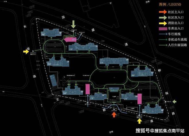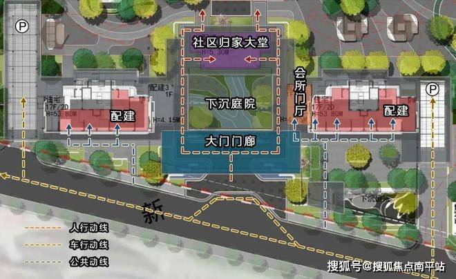 车行出入口则设计在南北两侧,直冲向马路,远离人行出入口,动线互不干扰。
