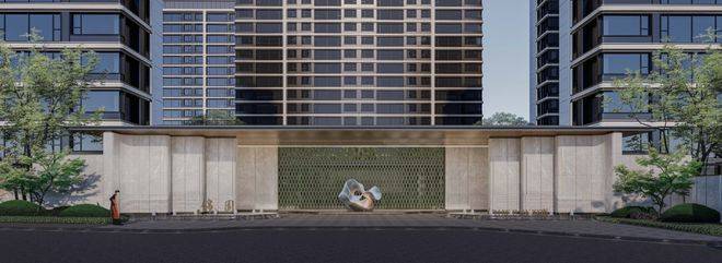大门两侧的对称景墙铺满石材,中央是艺术雕塑,打造出超级城市界面,尽显门庭威仪。