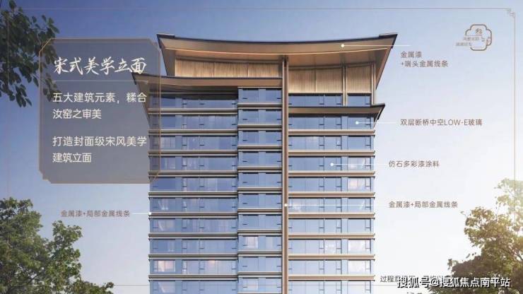 臻材实料:东方美学公建化立面,宋韵飞檐造型,高级配色金属材质线条+隔音隔热性能俱佳的LOW-E玻璃+深灰色真石漆基底,打造历久弥新的美学立面。