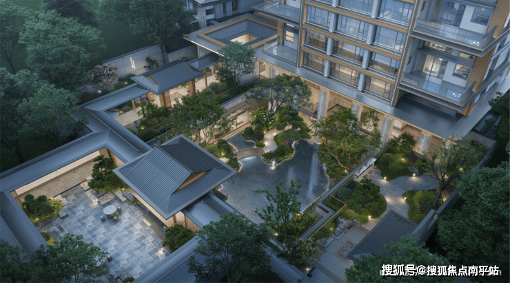 由门而入,园区里一步一景,长廊、亭台、珍稀花木……层层院落,构建长达 约130米五进景观轴, 约2300米双层游园步道,世界羽毛枫、紫薇等珍稀花木点缀, 近百种植物搭配,将东方诗意融入日常,形成“园中藏园”的层次感。