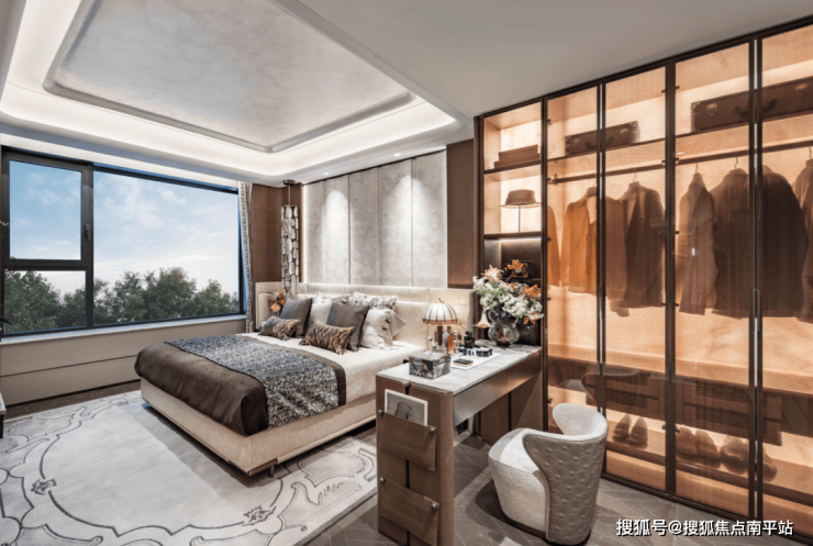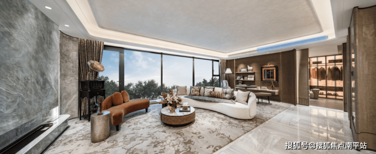 此次对外开放的还有建筑面积约143㎡户型样板间,将东方雅韵与当代艺术凝练为一场空间诗学。空间以“揽阅风华”为轴,打破传统隔阂,构建开放而有序的生活剧场。客厅、餐厅与景观阳台无缝串联,通高玻璃幕墙将自然光引入室内,光影在米白与香槟金的底色上流转,仿若一幅动态的抽象画。