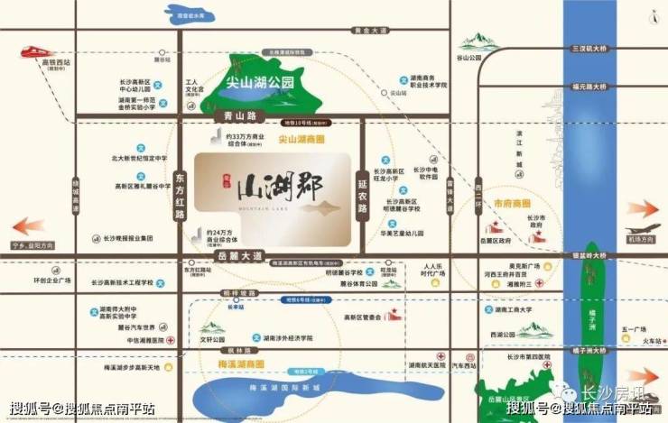 麓谷·山湖郡位于岳麓大道以北、东方红路以东、岳兴路以南、延农路以西,由湖南麓谷发展集团开发,楼盘共分为2期进行开发,一期地块为G07地块,二期为G18\G14\G08地块,分别涵盖了住宅、商铺、公寓、车位等多种业态。项目自带7.4万方商业,规划打造复合型特色主题商业街区。周边保利若比邻商业中心、梅溪湖步步高、河西王府井等醇熟商圈环伺,邻近明德麓谷学校、长沙湘江科技中等职业学校,地铁10号线规划从地块附近通过,区位优势十分明显。