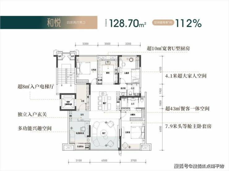 【四房两厅两卫】建筑面积约:128㎡实际得房率112%;实得面积约:144㎡,相当于旧规170㎡!(旧规户型按85%得房率计算,仅供参考)