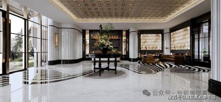 首层公区电梯厅,则采用了石材地面拼花、古铜色金属门套、蚀刻纹样、丝绒漆等,让归家成为一种视觉享受。