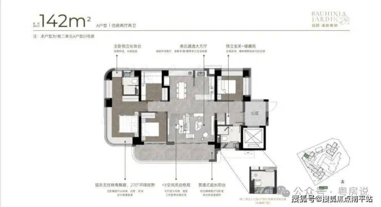 142m²四房两厅两卫的A户型:双龙抱珠户型,得房率约92-100%(含赠送),朝向为西南或东南。
