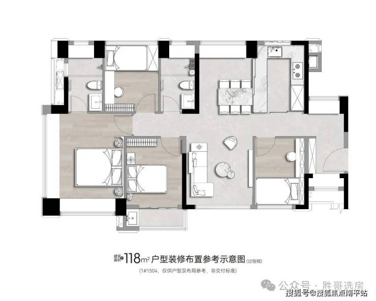 而118平的4房户型,直接做了个5开间且3房朝南,独立的入户空间,开放式厨房+南北通透的餐客一体,主卧南北通透带2个超大飘窗,同样是集美新城核心区遥遥领先的存在。以后放二手,也很有竞争力。如果喜欢超大客厅的,118户型也可以提供个性化定制,把靠近入口位置的卧室变成客厅的部分。